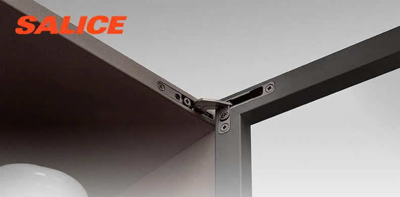 Bản lề Âm cánh nhôm kính SALICE dùng chung với profile nhôm, sử dụng cho ván dày tối thiểu 18mm, kích thước cánh cửa tối đa 600x2200 mm (chỉ sử dụng 1 bản lề trên và 1 bản lề dưới cho 1 cánh cửa), góc mở 105 độ