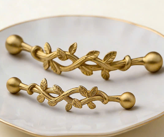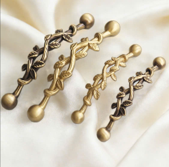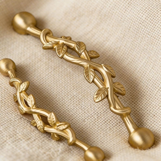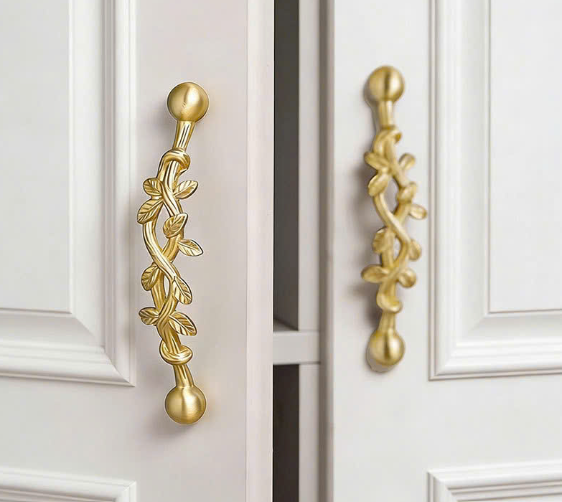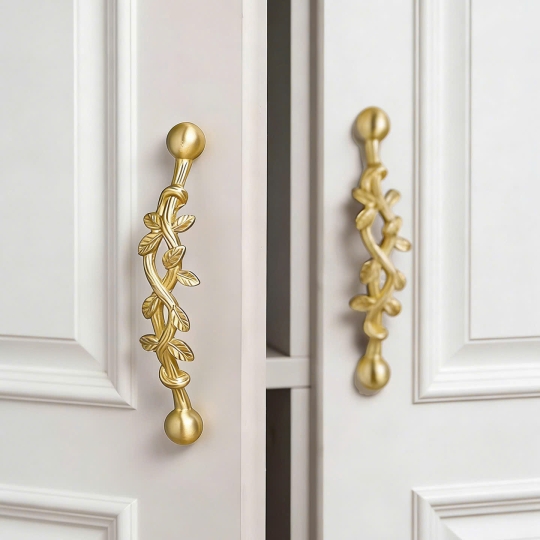 Tay nắm Đồng thau Cành lá - Màu Đồng Vàng  là phụ kiện nội thất mang đậm phong cách nghệ thuật với thiết kế lấy cảm hứng từ hình ảnh cành cây và lá uốn lượn mang tính  tự nhiên. Chi tiết lá và thân tay nắm được chạm khắc tinh xảo, kết hợp cùng đường nét mềm mại tạo nên tổng thể hài hòa, sang trọng và đầy tính thẩm mỹ. Thiết kế này giúp cánh tủ trở nên nổi bật hơn, đồng thời mang đến nét đẹp cổ điển và thanh lịch cho không gian nội thất.