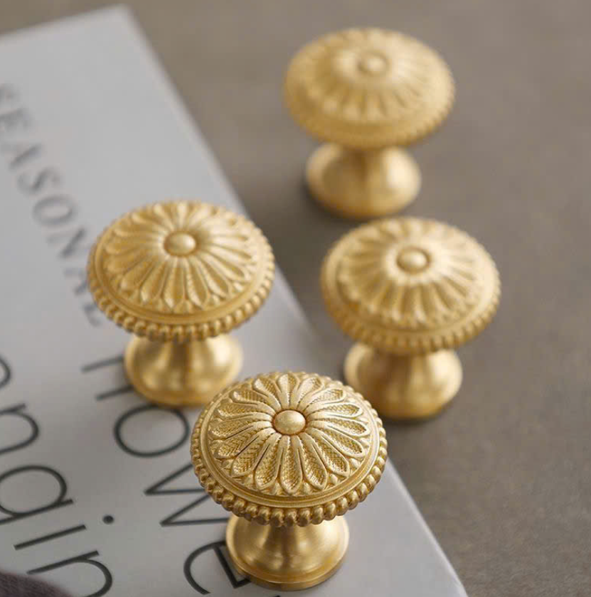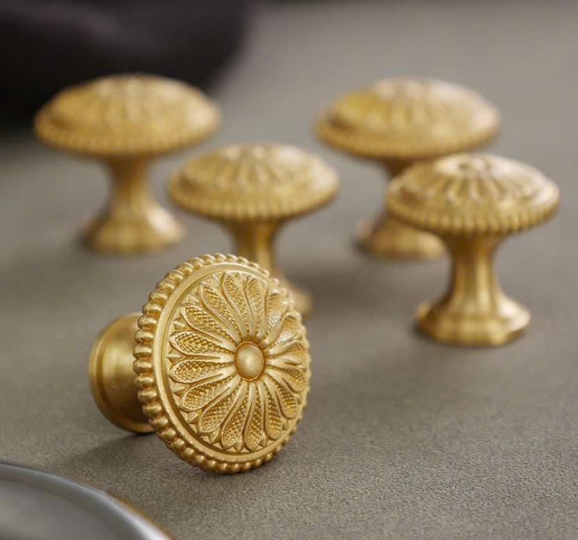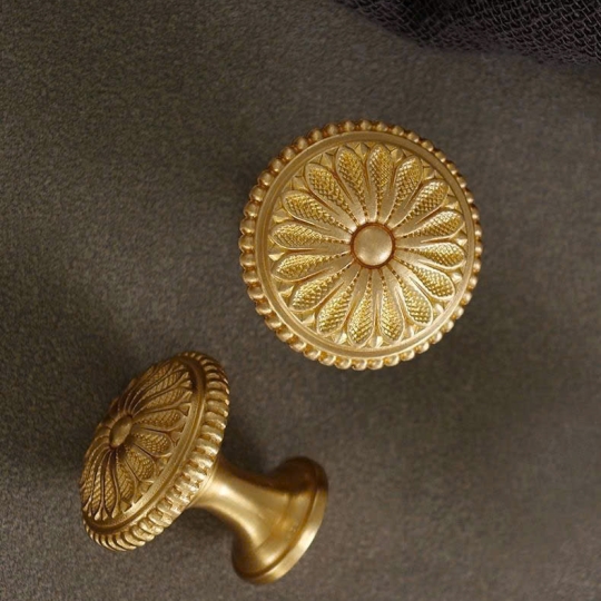 Tay Núm đồng Hoa cúc vàng mờ  mang đến cảm giác chắc chắn khi cầm nắm. Bề mặt của tay nắm được chăm chút tỉ mỉ với các đường nét tinh tế, tạo nên một tổng thể đẹp mắt và sang trọn. Thế hiện   sự hài hòa hiện đại và cao cấp cho các sản phẩm nội thất của bạn.